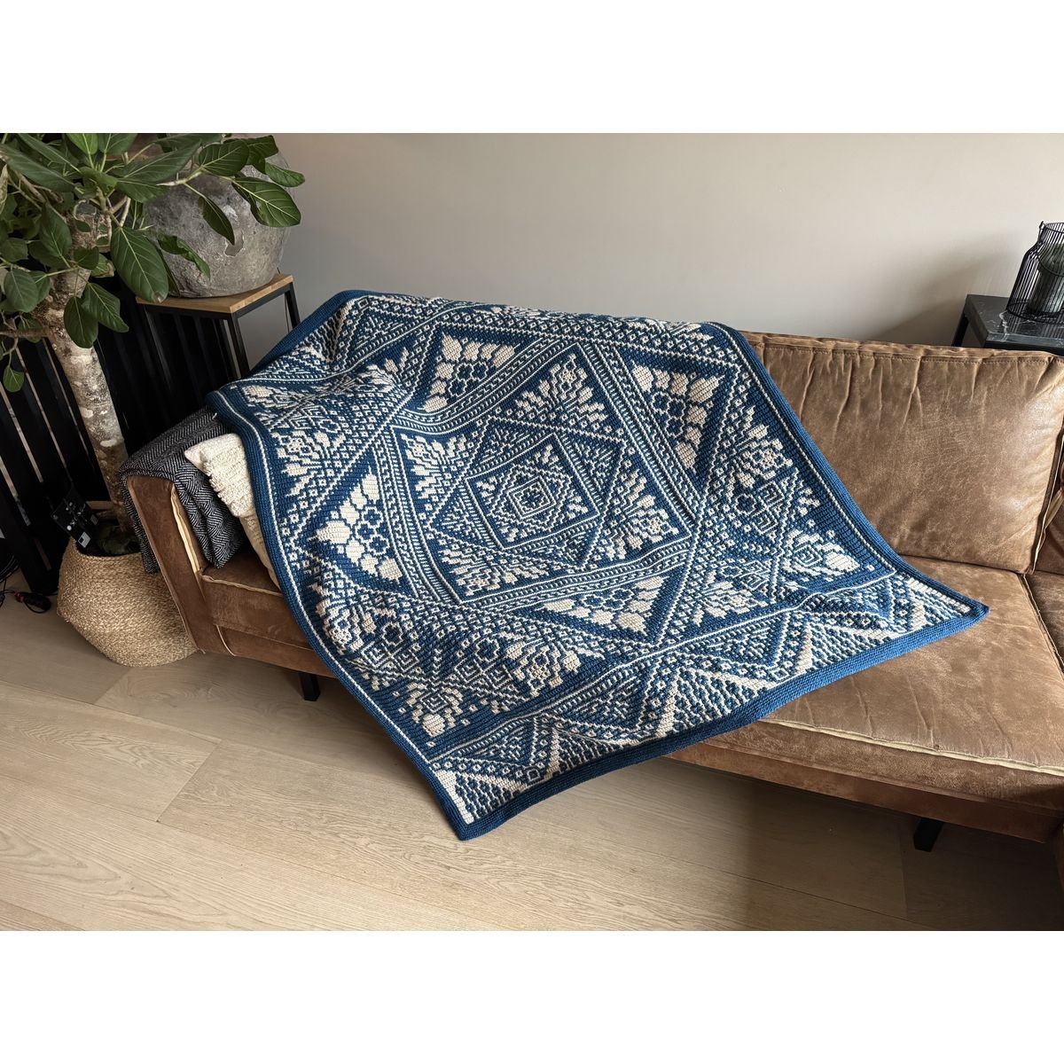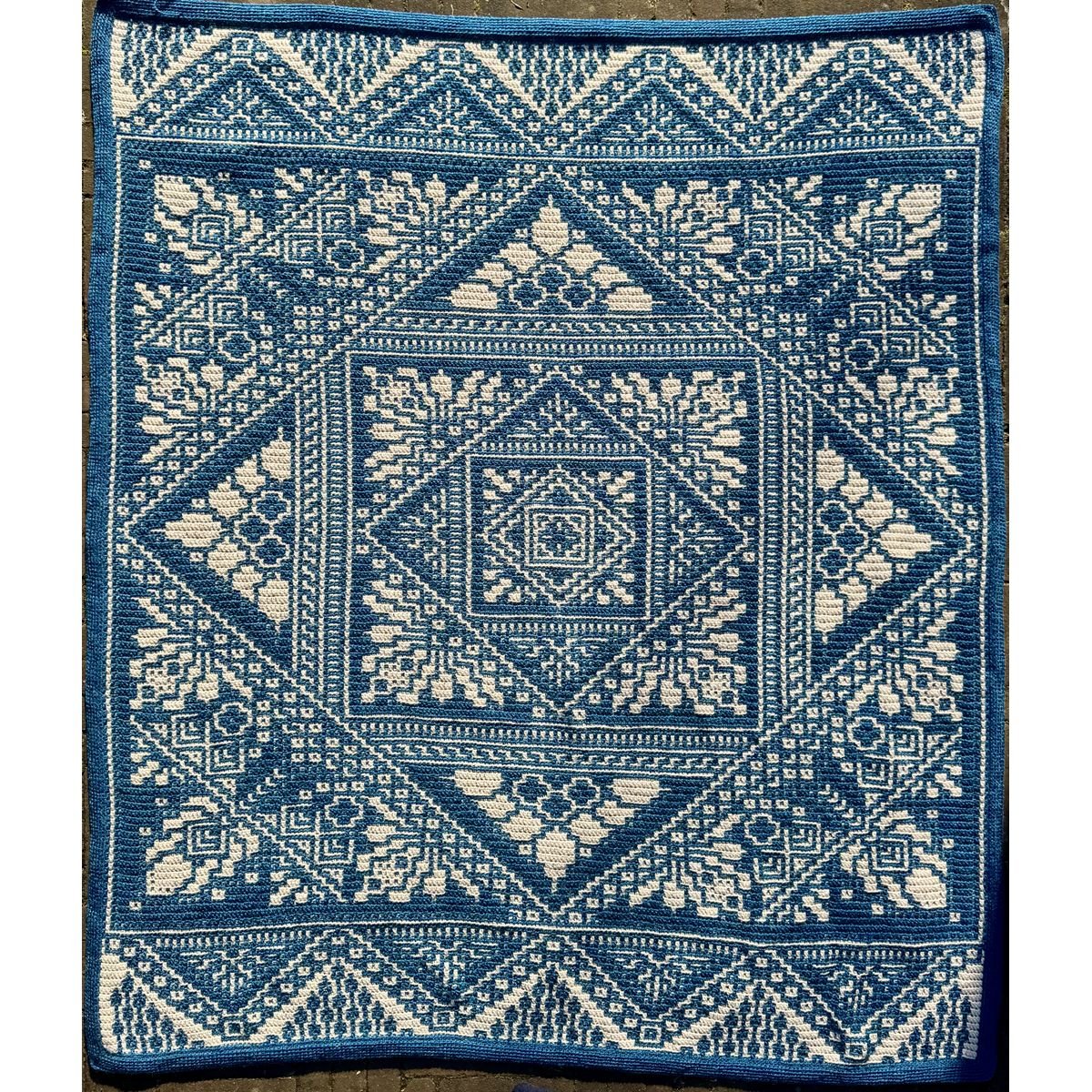 De deken wordt gehaakt in de overlay mozaïek techniek – een mooie haaksteek die het patroon prachtig laat uitkomen.
