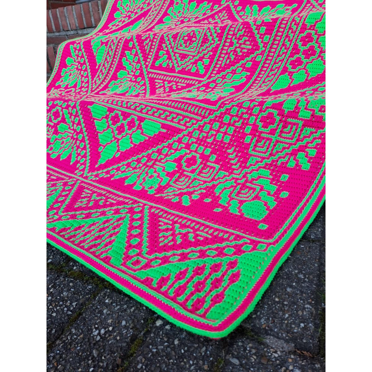 De deken wordt gehaakt in de overlay mozaïek techniek – een mooie haaksteek die het patroon prachtig laat uitkomen.