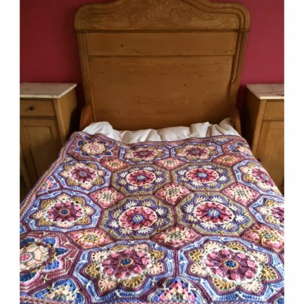 Janie Crow (Jane Crowfoot)’s populaire Persian Tiles deken is in een super mooi jasje gestoken, genaamd de Sandalwood. Omdat die versie van iemand anders is, kunnen we die niet direct zo verkopen, maar we hebben eentje laten maken die dezelfde sfeer uitstraalt, we hopen dat jullie deze net zo mooi vinden.