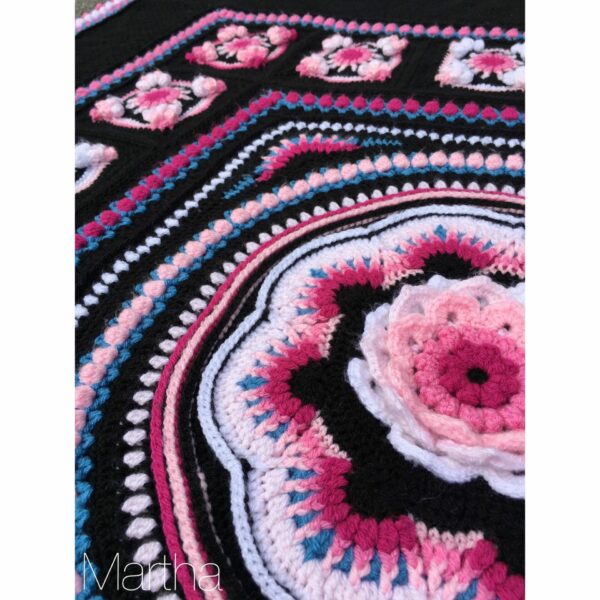De maat van de deken wordt ongeveer 115 x 115 cm, maar dat is altijd afhankelijk van je hand van haken.