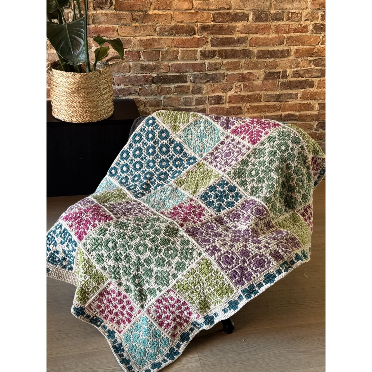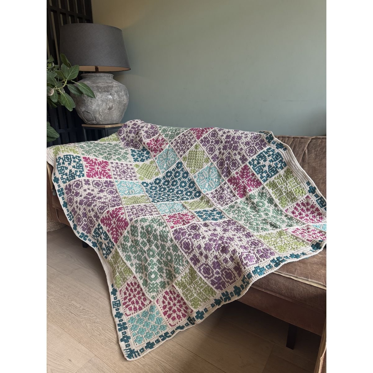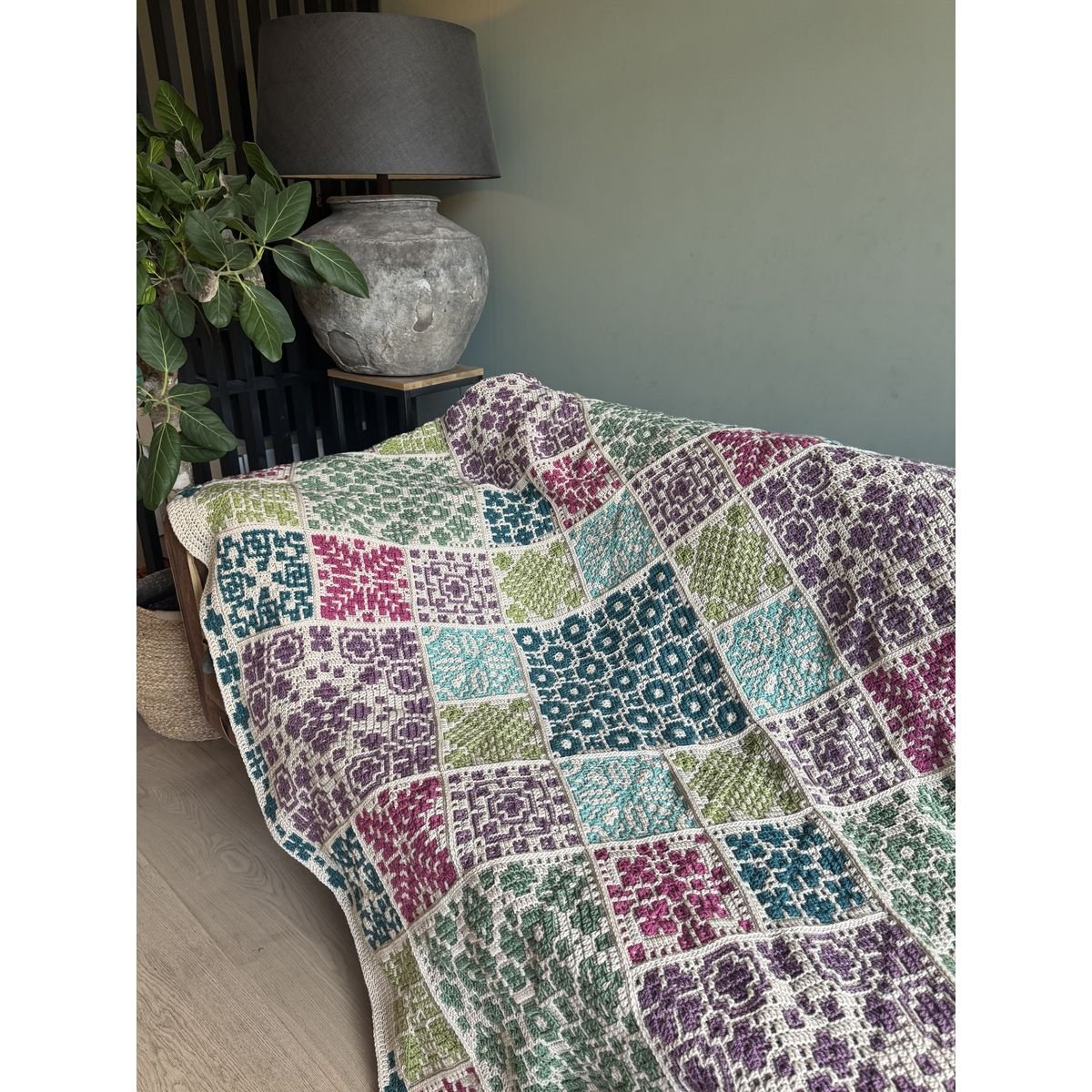 De deken wordt gehaakt in de overlay mozaïek techniek – een mooie, rustige en gelijkmatige haaksteek die het patroon prachtig laat uitkomen.