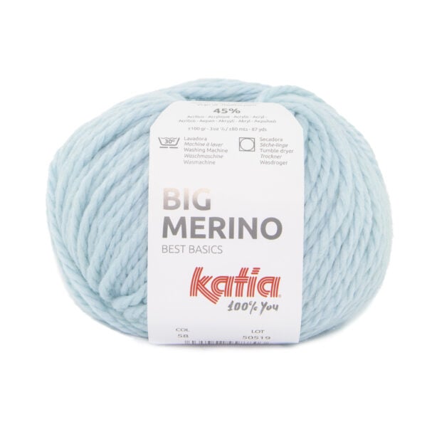 De Katia Big Merino 58 Waterblauw is gemaakt van 55% Merino Superwash, 45% Acryl en is geschikt voor naald 6,5 -7 mm