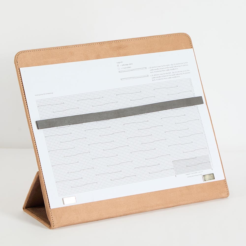 De patroonhouder is groot genoeg om je papieren patroon netjes in op te bergen en de drie bijgeleverde magneetjes zorgen dat het patroon in de juiste positie staat. Met de magneetstrip kun je eenvoudig bijhouden waar je bent gebleven. De stevige boekvormige houder is prachtig vormgegeven en bekleed met heerlijk zachte kunstsuède.