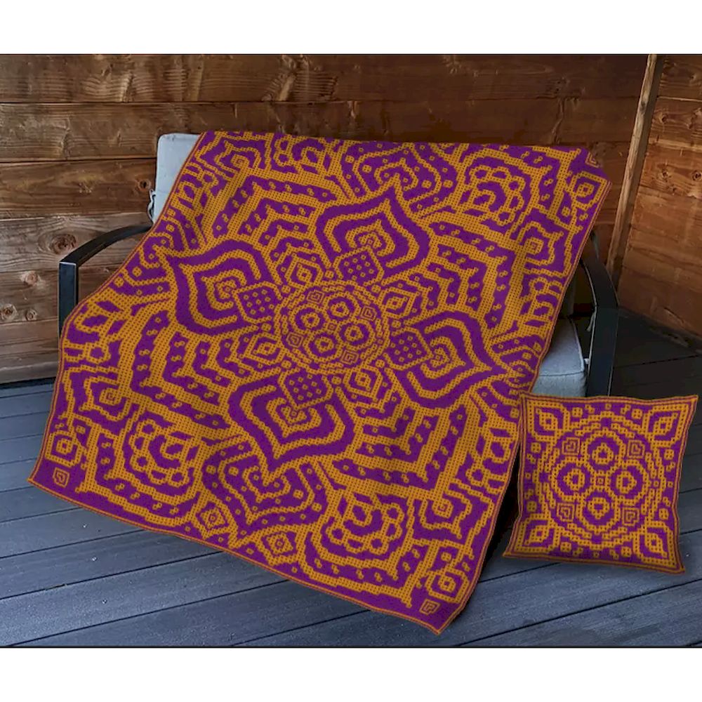 Deze mooie deken en kussen is ontworpen door isscha Conscious en Iris van “een mooi gebaar” heeft dit patroon wederom vertaald. De techniek die gebruikt wordt is interlocking Crochet. Door middel van stokjes en lossen kun je prachtige tekeningen maken, zoals je op de foto kunt zien.