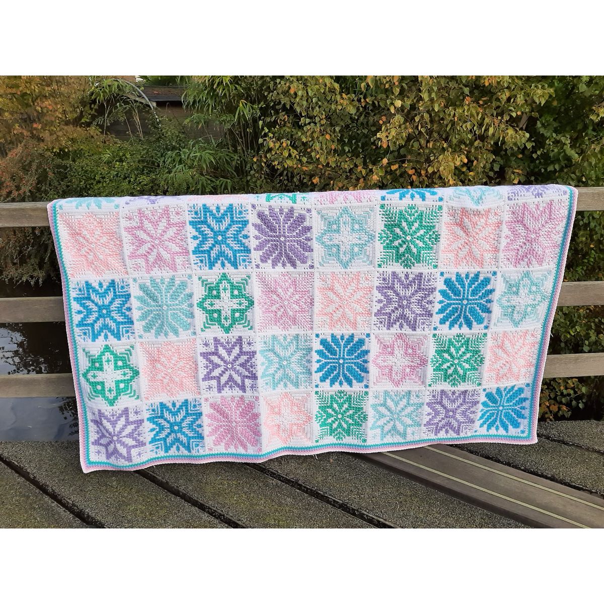 Wij hebben een garenpakket hiervoor samengesteld en het patroon is zoals altijd direct bij haar te bestellen. Deze deken is ontworpen door CrazyCrochetCatLady (Anke Wintermans) en bij deze deken wordt gebruik gemaakt van de techniek overlay mozaïek.