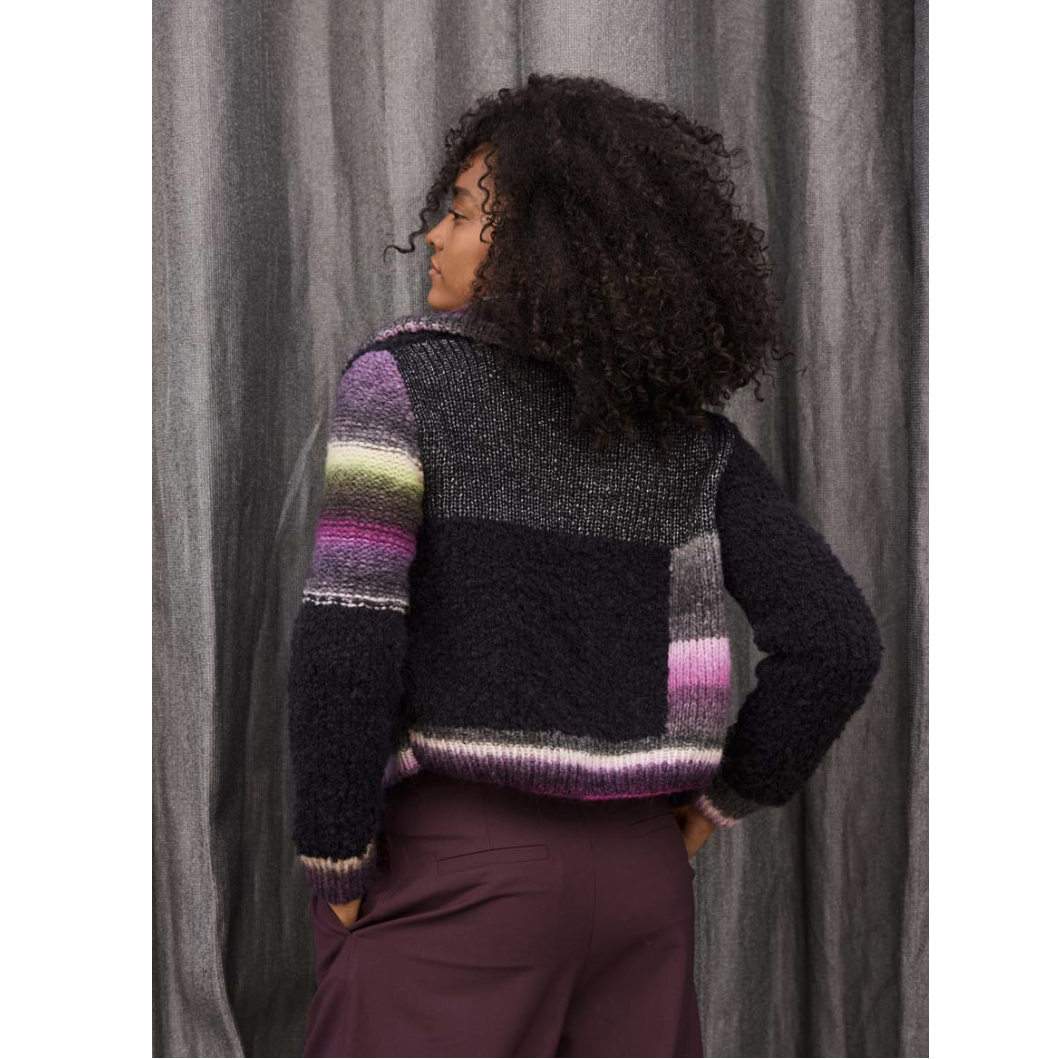 Dit Vest Lucida, Bomba en Orsetto maat 36-42 Journal 70 -56 is gemaakt van 3 mooie garens van Lana Grossa. De Lucida, een mooie draad van Merino wol en viscose, de Bomba, een hele mooie kleurenbom, gemaakt van Merino wol en een beetje polyamide, dat maakt het sterk. Dit allemaal samen met de Orsetto, gemaakt van 60 % Scheerwol merino en 40 % Alpaca, deze boucle draad maakt het vest echt heel bijzonder.