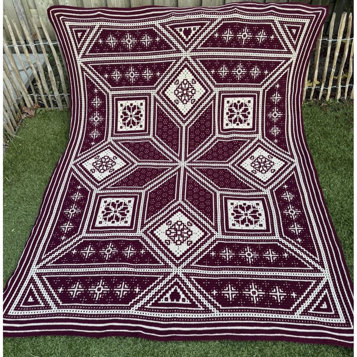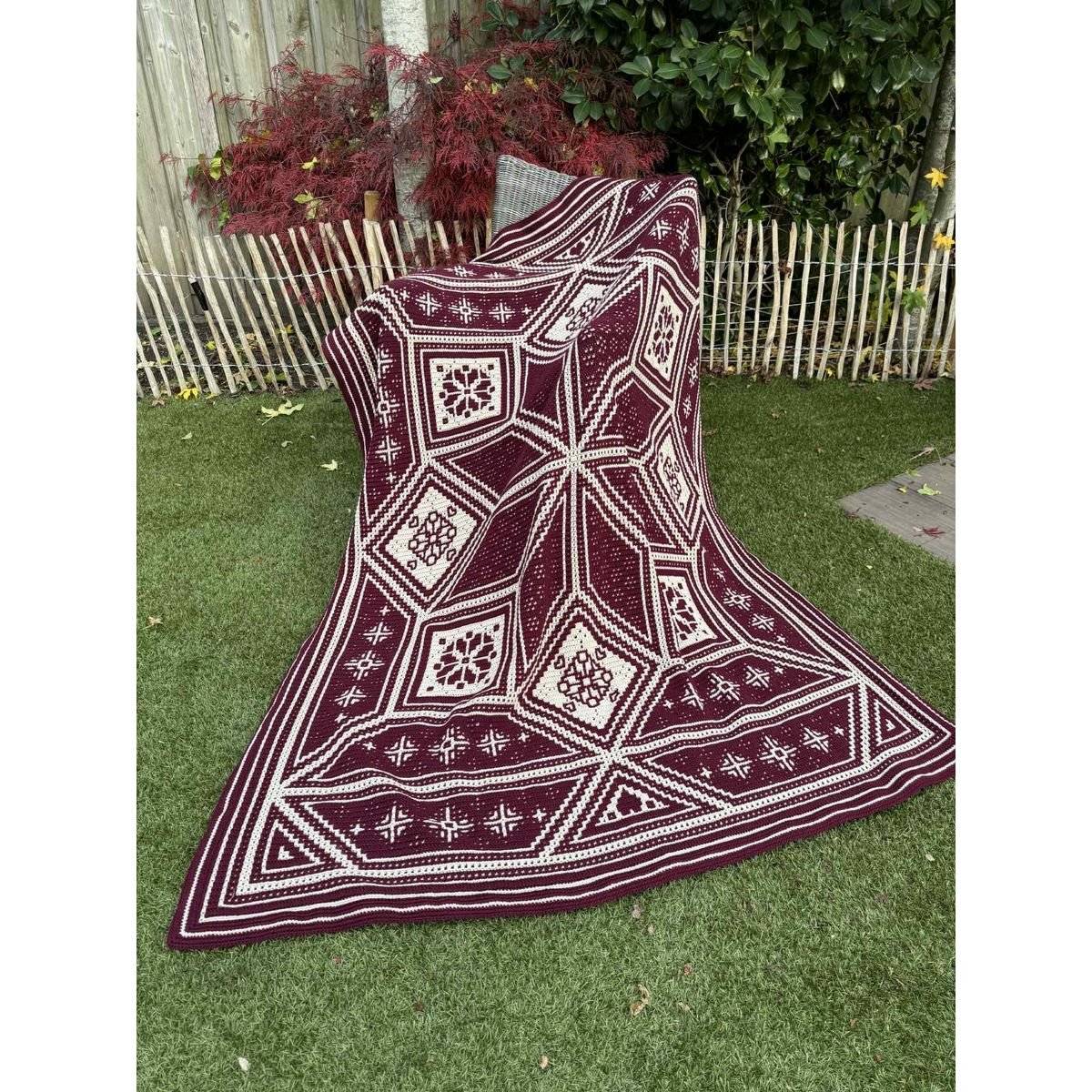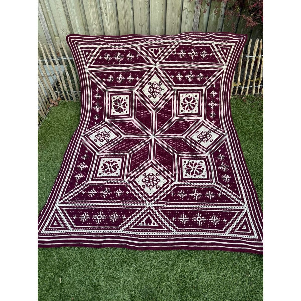 De deken wordt gehaakt in de overlay mozaïek techniek – een mooie, rustige en gelijkmatige haaksteek die het patroon prachtig laat uitkomen.